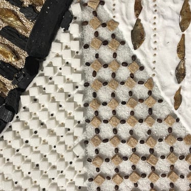 På lfö Center Konsthalls golv bygger hon repetitiva mönster av de varor som Sverige importerat/exporterat i transatlantiska handeln - kolonialvaror; kaffe, kakao, socker, salt, exotiska kryddor, pigment, torkad fisk - och kedjor av svenskt järn. Hon menar
